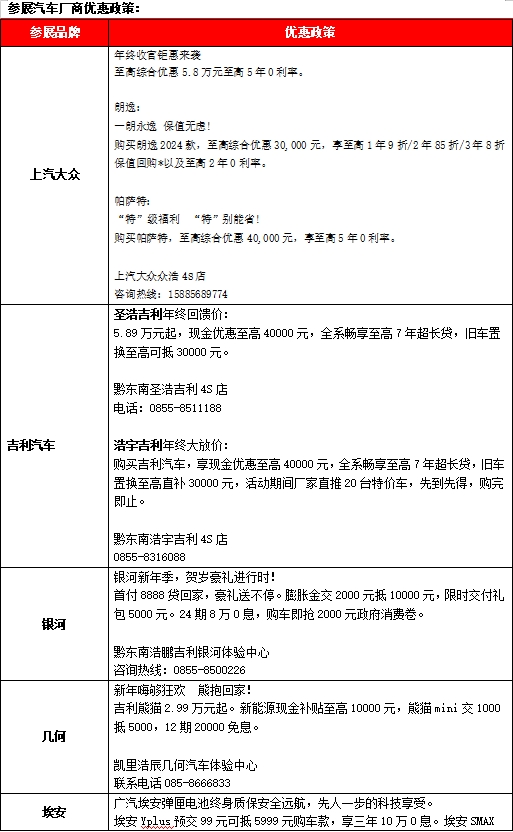 2023年12月18日,2023“惠購黔城樂享暖冬”汽車促銷會(huì)在國貿(mào)廣場啟動(dòng),活動(dòng)一直延續(xù)至12月24日,共7天。參展品牌有上汽大眾、吉利汽車、銀河汽車、幾何汽車、埃安汽車、奇瑞iCar、比亞迪、捷途汽車、長安汽車、上汽榮威、坦克汽車、哈弗汽車、歐拉汽車等13個(gè)品牌。自主、合資品牌一應(yīng)俱全,有新能源汽車,燃油汽車等多種類型供市民選擇。