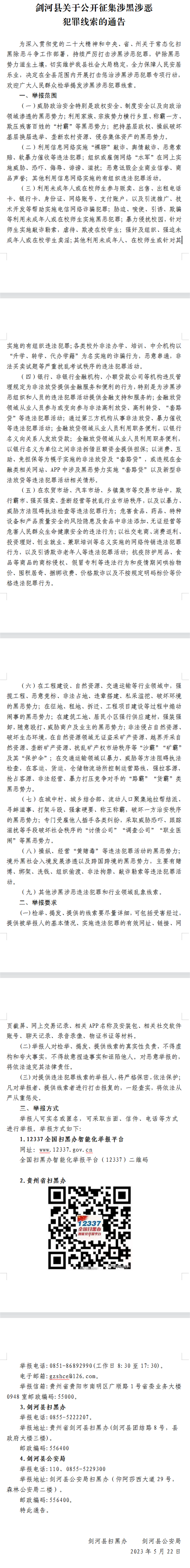 黔東南一縣關于公開征集涉黑涉惡犯罪線索的通告