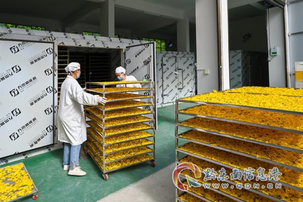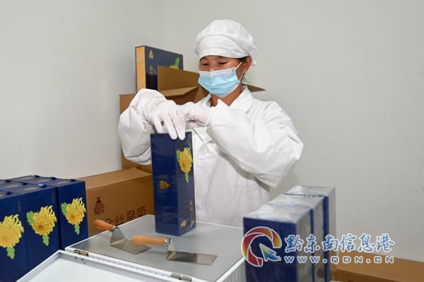 鎮里聯合社還建了菊花茶加工廠,將采摘的新鮮金絲皇菊運到加工廠烘烤車間烘干,再進行包裝、銷售,從而增加產品附加值和延長產業鏈。