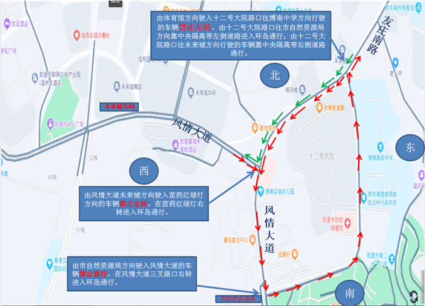(三)由市自然資源局方向駛?cè)腼L(fēng)情大道的車輛禁止直行,在風(fēng)情大道三叉路口右轉(zhuǎn)進(jìn)入環(huán)島通行。