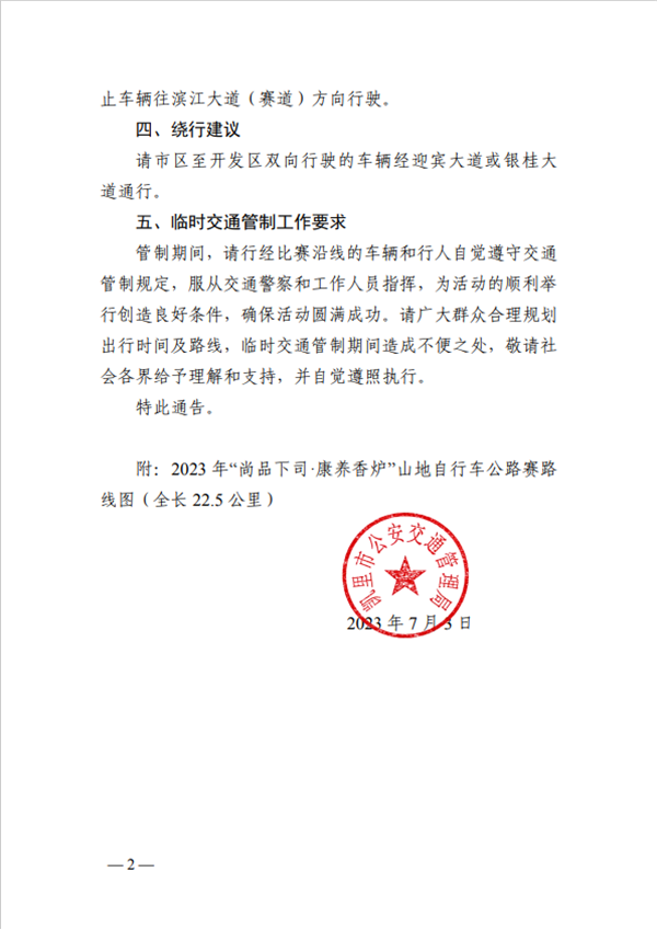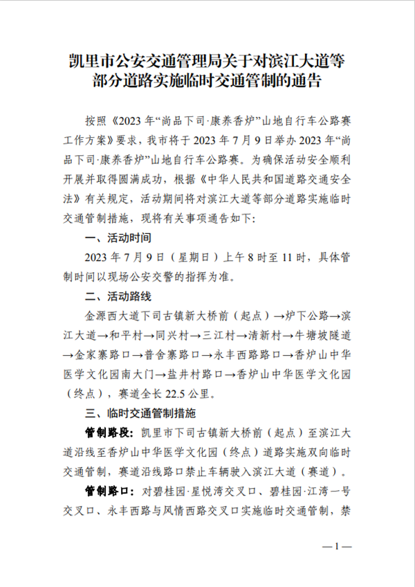 按照《2023年“尚品下司·康養香爐”山地自行車公路賽工作方案》要求,我市將于2023年7月9日舉辦2023年“尚品下司·康養香爐”山地自行車公路賽。為確保活動安全順利開展并取得圓滿成功,根據《中華人民共和國道路交通安全法》有關規定,活動期間將對濱江大道等部分道路實施臨時交通管制措施,現將有關事項通告如下: