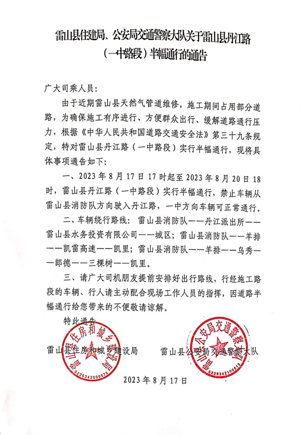 一、2023年8月17日17時起至2023年8月20日18時,雷山縣丹江路(一中路段)實行半幅通行,禁止車輛從雷山縣消防隊方向駛入丹江路,一中方向車輛可正常通行。