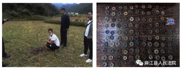 麻江縣龍山鎮、谷硐鎮等地利用金屬探測儀在稻田里探測到古錢幣、銅雜件后挖掘。事后,被盜文物被麻江縣公安局扣押并移交麻江縣文物局。經鑒定,涉案物品中607件(其中552件古錢幣、55件銅雜件)為一般文物,市場價值10671元。