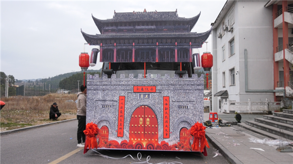 在花車制作現場,技術工人們正在有條不紊地對花車各組成部分進行組裝制作�;ㄜ囈陨ね脼榧槲�,在花車周身融入黃平美麗山水、特色景點,整個花車色彩絢麗喜慶。