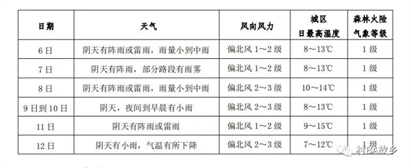 預計本周我州以陰雨天氣為主,局地有雷電,部分路段有雨霧。城區日最高氣溫10~15℃,將出現在8日和11日;日最低氣溫3~7℃,將出現在9日夜間。雷雨天氣,注意防雷安全;雨天路滑,能見度低,出行注意交通安全;氣溫較低,取暖注意用火用電安全,謹防火災和一氧化碳中毒。