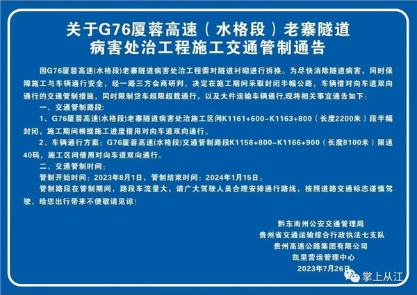 1、G76廈蓉高速(水格段)老寨隧道病害處治施工區間K1161+600-K1163+800(長度2200米)段半幅封閉,施工期間根據施工進度借用對向車道雙向通行。