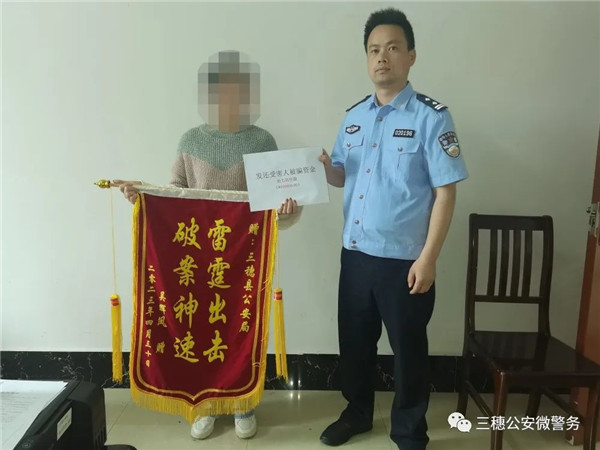 2023年4月2日,三穗縣公安局接吳某某報警稱其被人冒充公安警務人員詐騙280100元。民警立即開展調查,趕赴廣東、江西等地開展工作,抓獲犯罪嫌疑人4人,追回被騙資金10.9萬元。4月27日,我局民警將追回的10.9萬元被騙資金返還給受害人。5月6日,吳某某將一面印有“雷霆出擊破案神速”字樣的錦旗送到民警手中表示感謝。