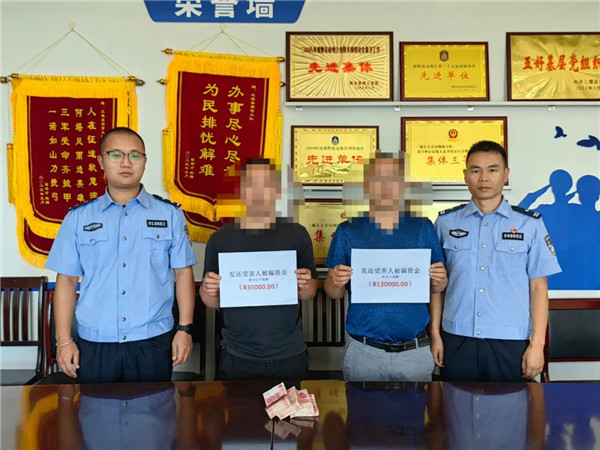 6月26日,三穗公安刑偵大隊民警將追回的3.5萬元被詐騙資金返還給王某某,同時返還了文筆街道曾某某被詐騙資金13萬元。