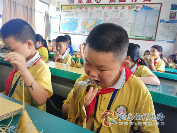 6月20日,在端午節即將來臨之際,臺江縣城關一小三年級(6)班的同學們開展了一次“傳統節日進課堂”活動,同學們一起品嘗粽子,相互祝福。