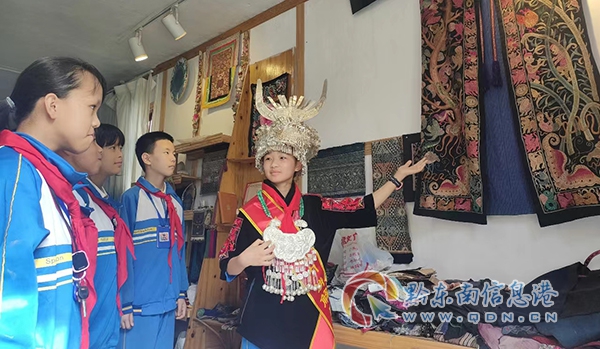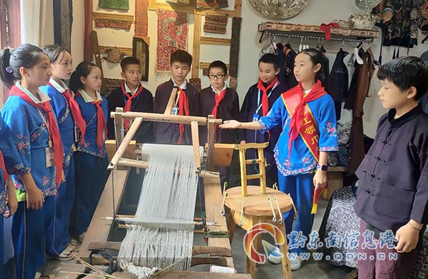 在臺江縣民族民間服飾織錦工藝廠,紅領巾講解員吳璐瑤給同學們介紹了古老織布機織布的過程、臺江苗族九個支系的服飾和苗繡的12類技法、蠟染的原材料及制作過程等,讓同學們對苗族文化有了更深層次的了解。