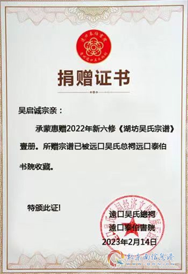 本網(wǎng)訊2023年2月14日,江西省撫州市黎川縣湖坊鄉(xiāng)吳氏后裔吳啟誠捐贈譜書《江西省黎川縣湖坊吳氏宗譜》一部給貴州遠(yuǎn)口泰伯書院收藏。