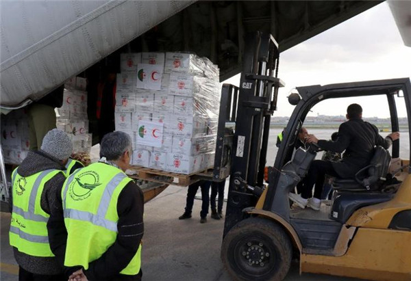 2月7日,在敘利亞阿勒頗國際機場,工作人員卸載阿爾及利亞提供的救援物資。新華社發