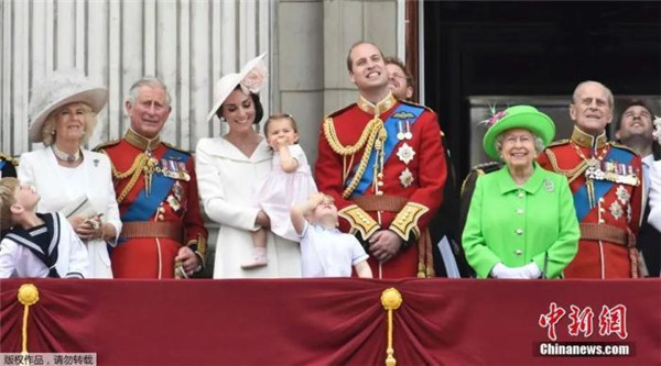 資料圖:當地時間2016年6月11日,英國女王伊麗莎白二世的90歲官方生日慶典舉行,王室成員登上白金漢宮陽臺觀看皇家軍隊閱兵儀式。
