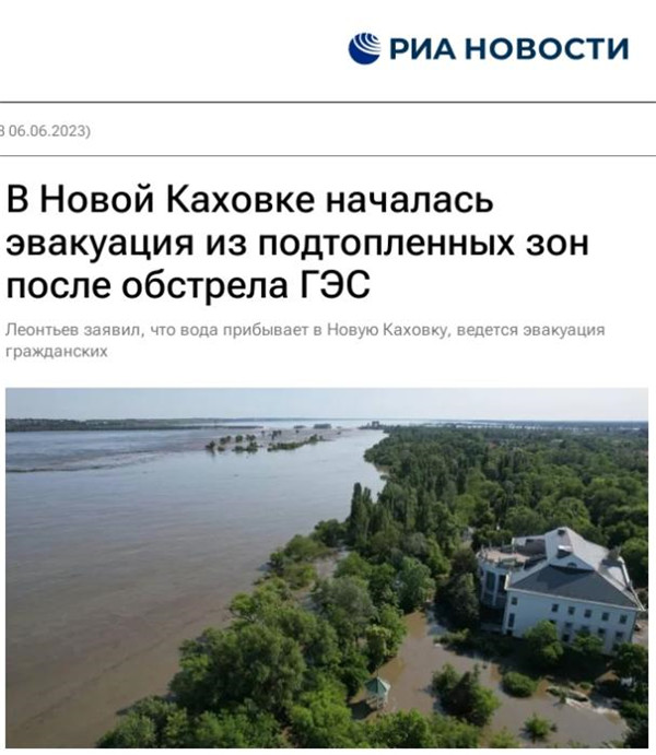 俄羅斯外交部表示,大壩遭破壞后,第聶伯河下游水位大幅上升,定居點被洪水淹沒,數千人需要疏散。此外,卡霍夫卡水庫水位下降將使克里米亞地區供水受阻。