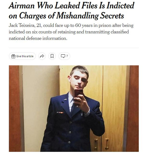 中新網 6月16日電綜合外媒報道,當地時間15日,美國聯邦大陪審團起訴21歲的空軍國民警衛隊成員杰克•特謝拉(Jack Teixeira),罪名是保留和傳播國防機密信息等。