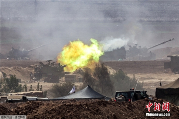 圖為當地時間10月12日,以色列軍隊在以色列南部與加沙邊界附近發(fā)射炮彈。