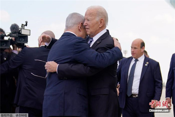 當地時間18日11時許,美國總統拜登抵達以色列特拉維夫后,與以總理內塔尼亞胡擁抱。