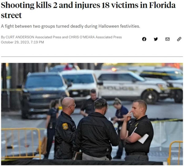 中新網 10月30日電據美國廣播公司(ABC)報道,當地時間29日,美國佛羅里達州坦帕市萬圣節慶祝活動期間發生大規模槍擊,造成2人死亡,18人受傷。