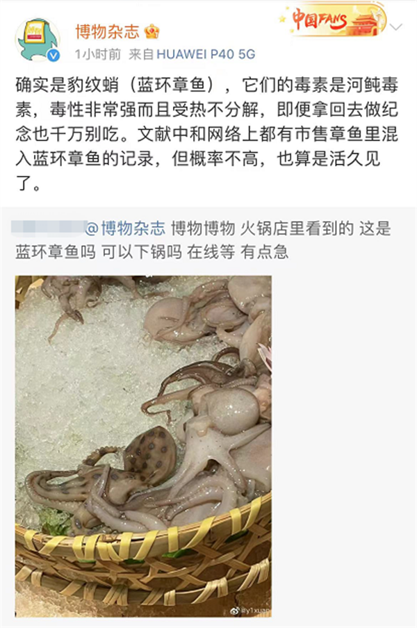 隨后, 博物雜志回復:“確實是豹紋蛸(藍環章魚),它們的毒素是河鲀毒素,毒性非常強而且受熱不分解,即便拿回去做紀念也千萬別吃。文獻中和網絡上都有市售章魚里混入藍環章魚的記錄,但概率不高,也算是活久見了。”