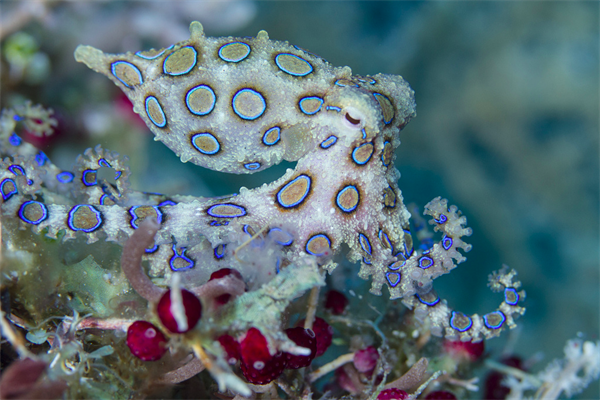 藍環章魚的毒性可通過顏色顯示出來,在不同環境中,它會變成與環境相似的保護色,一旦感受到威脅,表皮顏色會變得艷麗,藍色環閃爍的時候,也正是最危險的時候,它正處于警戒狀態。