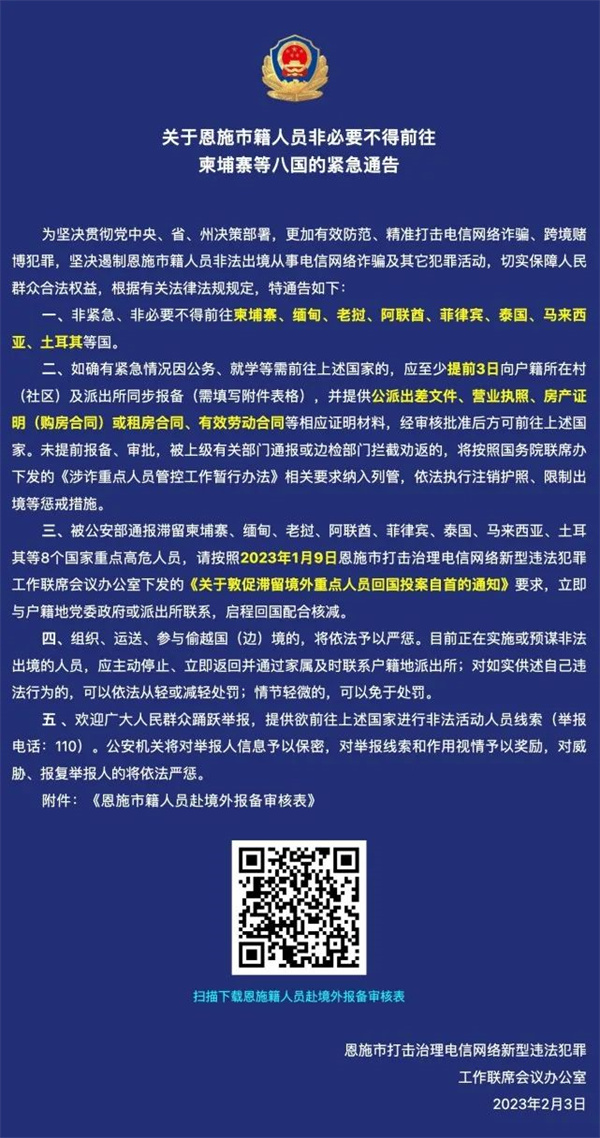 “恩施市公安局”微信公眾號2月7日消息,恩施市打擊治理電信網絡新型違法犯罪工作聯席會議辦公室發(fā)布緊急通告,為堅決貫徹黨中央、省、州決策部署,更加有效防范、精準打擊電信網絡詐騙、跨境賭博犯罪,堅決遏制恩施市籍人員非法出境從事電信網絡詐騙及其它犯罪活動,切實保障人民群眾合法權益,根據有關法律法規(guī)規(guī)定,特通告如下: