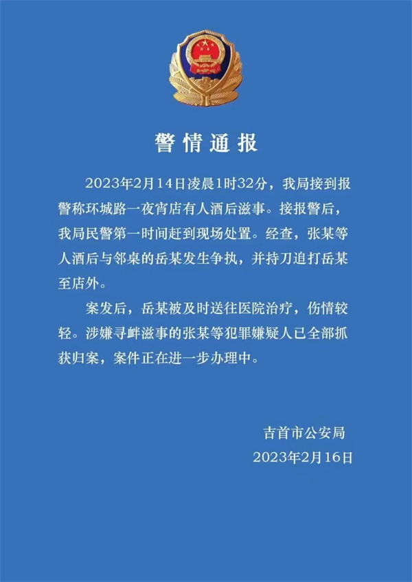 2月17日,湖南省吉首市公安局發布警情通報稱,2月14日凌晨1時32分,該局接到報警稱環城路一夜宵店有人酒后滋事。接報警后,該局民警第一時間趕到現場處置。經查,張某等人酒后與鄰桌的岳某發生爭執,并持刀追打岳某至店外。