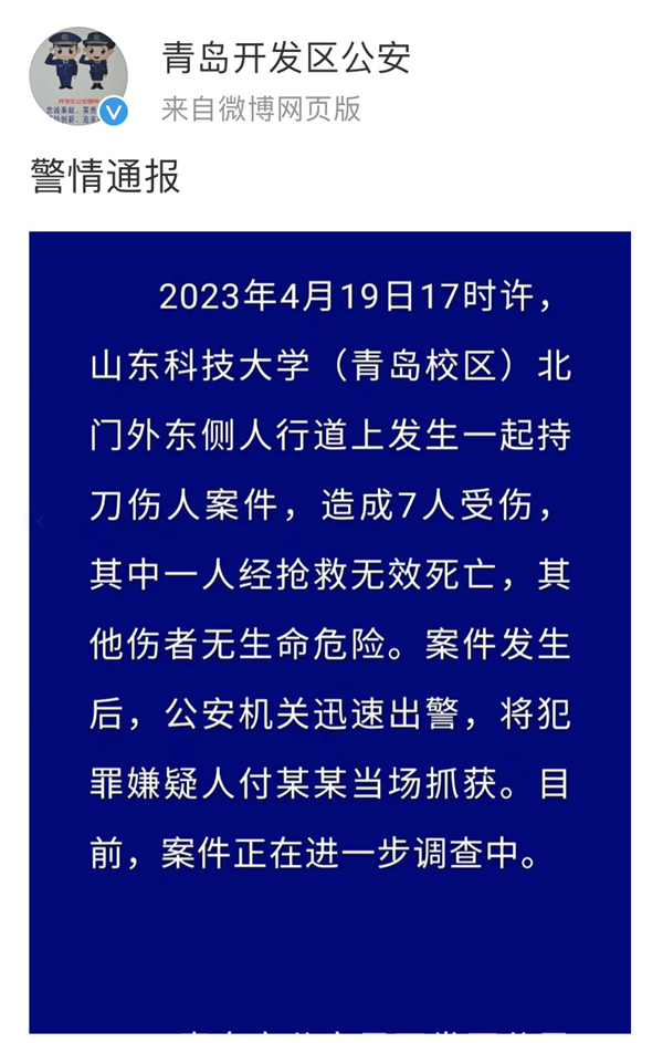 4月19日晚,“青島開發區公安”官方微博發布警情通報:2023年4月19日17時許,山東科技大學(青島校區)北門外東側人行道上發生一起持刀傷人案件,造成7人受傷,其中1人經搶救無效死亡,其他傷者無生命危險。案件發生后,公安機關迅速出警,將犯罪嫌疑人付某某當場抓獲。目前,案件正在進一步調查中。