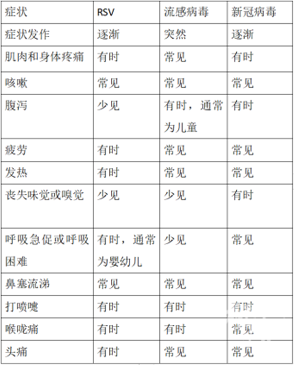 雖然他們有不少相似的癥狀,但也是有一些區(qū)別的:如流感病毒感染潛伏期短,通常是突然發(fā)熱,高熱為主,而另外兩種則是逐漸發(fā)病,且RSV感染的患兒中腹瀉較為少見,可以參考表格內(nèi)容,明確診斷的話建議行相關(guān)核酸或抗原檢測(cè)。