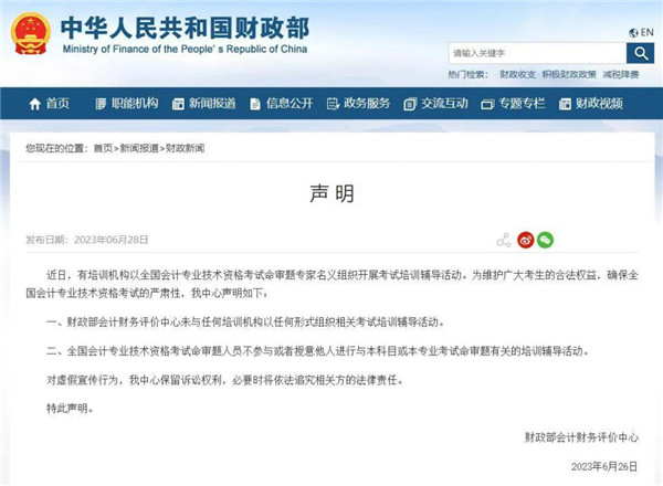 財政部會計財務(wù)評價中心6月28日發(fā)表聲明稱,未與任何培訓機構(gòu)以任何形式組織相關(guān)考試培訓輔導活動。