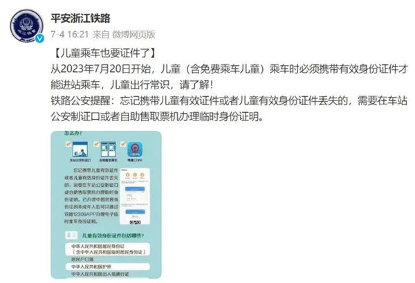 據平安浙江鐵路消息,從2023年7月20日開始,兒童(含免費乘車兒童)乘車時必須攜帶有效身份證件才能進站乘車。忘記攜帶兒童有效證件或者兒童有效身份證件丟失的,需要在車站公安制證口或者自助售取票機辦理臨時身份證明。換句話說,兒童乘車一定要帶相關證件。