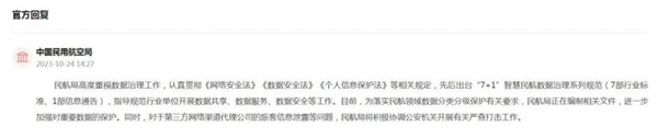 中國民用航空局回應稱,民航局高度重視數(shù)據(jù)治理工作,認真貫徹《網(wǎng)絡安全法》《數(shù)據(jù)安全法》《個人信息保護法》等相關規(guī)定,先后出臺"7+1"智慧民航數(shù)據(jù)治理系列規(guī)范(7部行業(yè)標準、1部信息通告),指導規(guī)范行業(yè)單位開展數(shù)據(jù)共享、數(shù)據(jù)服務、數(shù)據(jù)安全等工作。目前,為落實民航領域數(shù)據(jù)分類分級保護有關要求,民航局正在編制相關文件,進一步加強對重要數(shù)據(jù)的保護。同時,對于第三方網(wǎng)絡渠道代理公司的旅客信息泄露等問題,民航局將積極協(xié)調公安機關開展有關嚴查打擊工作。