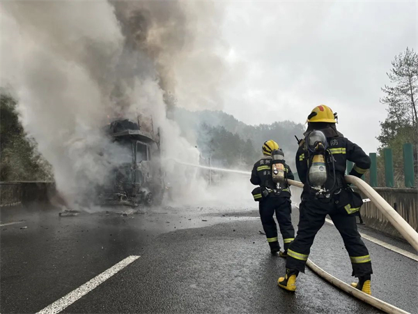 1月14日,遵義市余慶縣消防接到報警稱:余慶縣江都高速屯馬坡1號大橋附近一輛滿載轎車的貨車在行駛途中發生起火,余慶縣消防救援大隊接警后立即趕赴現場救援。
