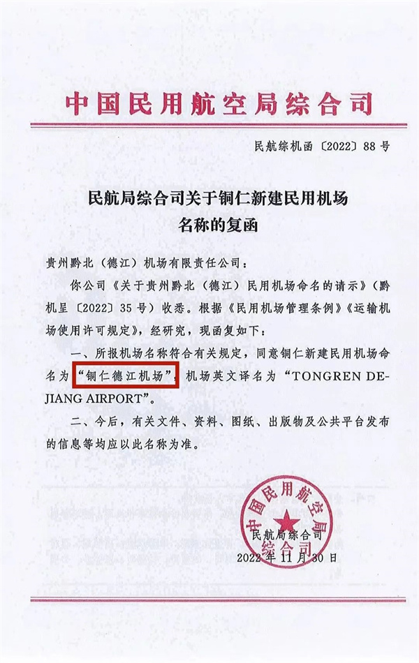 《民航局綜合司關于銅仁新建民用機場名稱的復函》