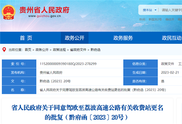 省人民政府關于同意駕歐至荔波高速公路有關收費站更名的批復黔府函〔2023〕20號