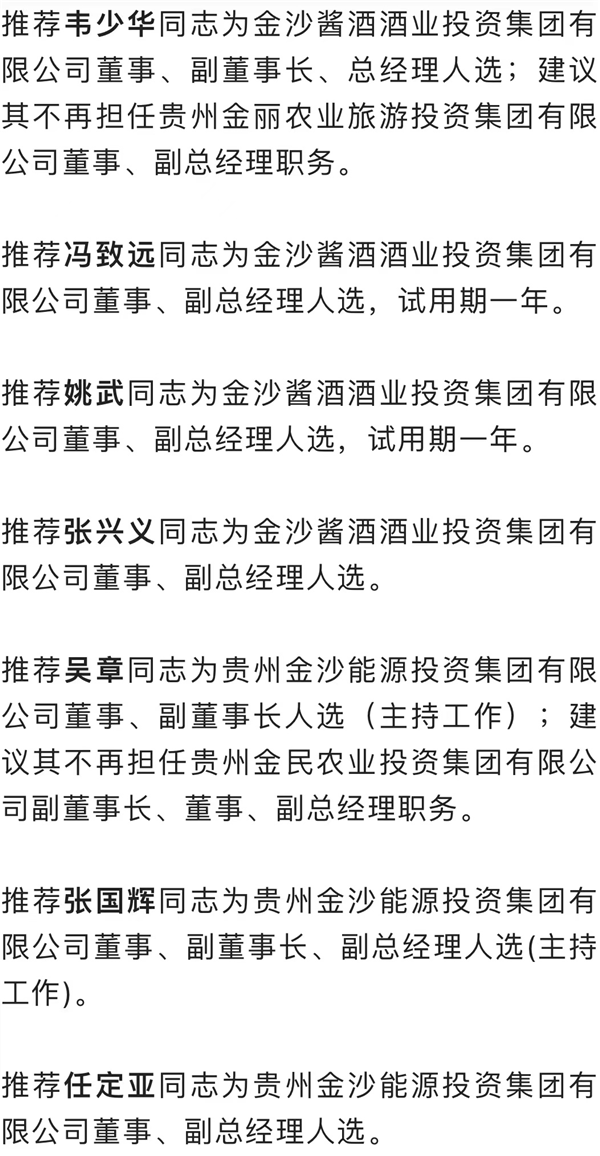 投資集團有限公司董事、副董事長人選(主持工作,保留正科長級);建議其不再擔任貴州金民農業投資集團有限公司副董事長、董事、總經理職務。