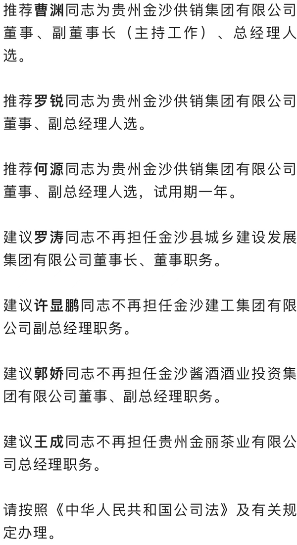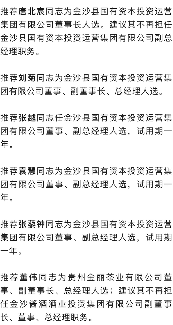 推薦趙紫同志為金沙建工集團有限公司董事、副總經理人選;建議其不再擔任金沙縣建設