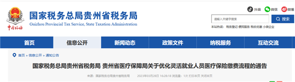 國家稅務總局貴州省稅務局官網28日發布《國家稅務總局貴州省稅務局貴州省醫療保障局關于優化靈活就業人員醫療保險繳費流程的通告》,自2023年4月1日起,對貴州省靈活就業人員醫療保險(含基本醫療保險、大額醫療補助)繳費流程進行優化,詳情——