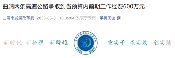 據曲靖市發展改革委發布,近日,宣威永安機場高速(沾益炎方至花山)和宣威至盤州高速公路各爭取到省預算內前期工作經費300萬元,助力曲靖高速公路項目建設。