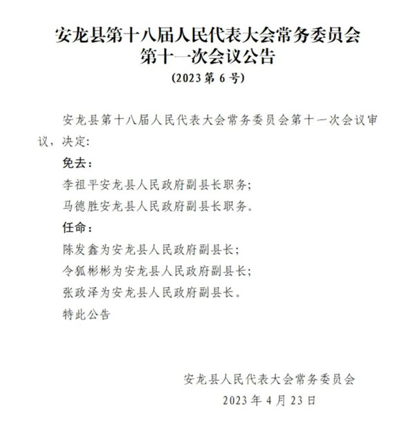 4月23日,安龍縣第十八屆人大常委會(huì)第十一次會(huì)議舉行,會(huì)議表決通過(guò)了有關(guān)人事任免議案。