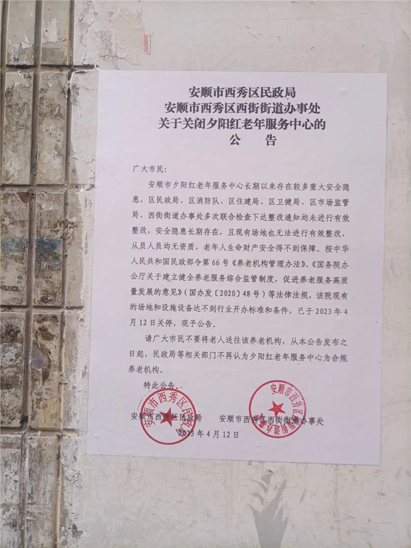 近日,安順市西秀消防救援大隊報請當(dāng)?shù)卣猓?lián)合民政部門依法對一存在嚴(yán)重火災(zāi)隱患拒不整改的養(yǎng)老福利機構(gòu)實施了關(guān)停。