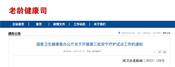 根據(jù)《中共中央國務(wù)院關(guān)于加強新時代老齡工作的意見》關(guān)于“穩(wěn)步擴大安寧療護試點”的要求,在前兩批安寧療護試點工作的基礎(chǔ)上,我委決定繼續(xù)擴大試點范圍,自本通知印發(fā)之日起在全國開展第三批安寧療護試點工作。現(xiàn)將有關(guān)事項通知如下。
