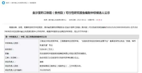 8月11日,貴州省發(fā)展和改革委員會《金沙至黔江鐵路(貴州段)可行性研究報告編制中標(biāo)候選人公示》發(fā)布,項(xiàng)目可行性研究工作即將正式啟動。