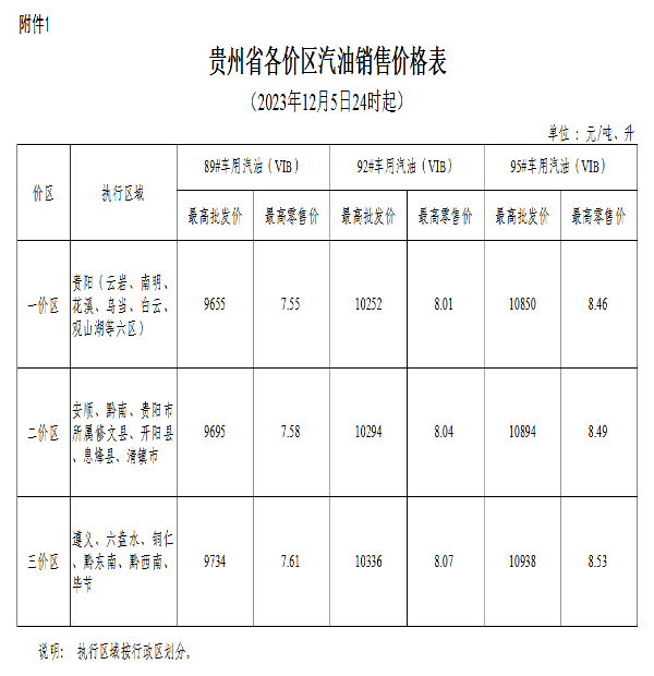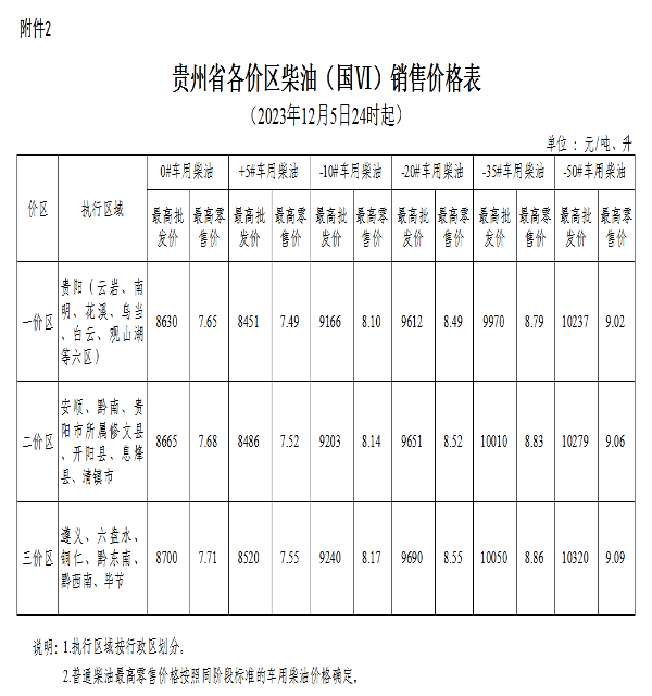 根據國家成品油價格形成機制,國家發展改革委決定自2023年12月5日24時起下調國內成品油價格。按照國家調整要求和相關規定,貴州省89#汽油(國ⅥB)、0#柴油價格每噸在現行標準基礎上分別降低55元、50元,具體價格可由各經營企業在不超過最高批發、零售價格的前提下確定。調整后各油品最高價格見附件。