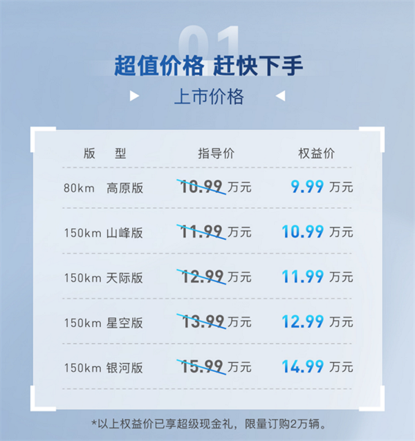 新車上市期間,凱翼汽車針對昆侖iHD推出上市權益超級大禮,消費者購車享受999元抵扣10000元購車款,優惠后的權益售價為——80km高原版9.99萬元,150km山峰版10.99萬元,150km天際版11.99萬元,150km星空版12.99萬元,150km銀河版14.99萬元。