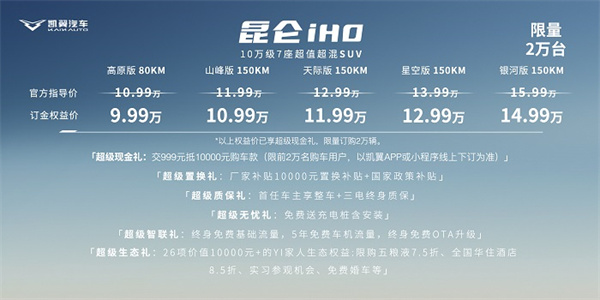 新車上市期間,凱翼汽車針對昆侖iHD推出上市權益超級大禮,消費者購車享受999元抵扣10000元購車款,優惠后的權益售價為——80km高原版9.99萬元,150km山峰版10.99萬元,150km天際版11.99萬元,150km星空版12.99萬元,150km銀河版14.99萬元。
