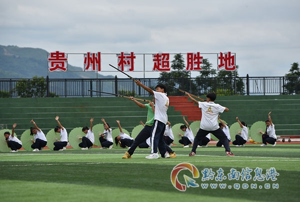 本網訊 近日,炎炎烈日下,榕江縣的“村超”現場熱情如火,一場獨特的文化盛宴在此上演。從江縣初中教育第一集團的師生們以精彩紛呈的非遺節目,為這場活動增添了濃厚的民族色彩,讓非遺文化在“村超”舞臺上綻放出絢麗的光彩。