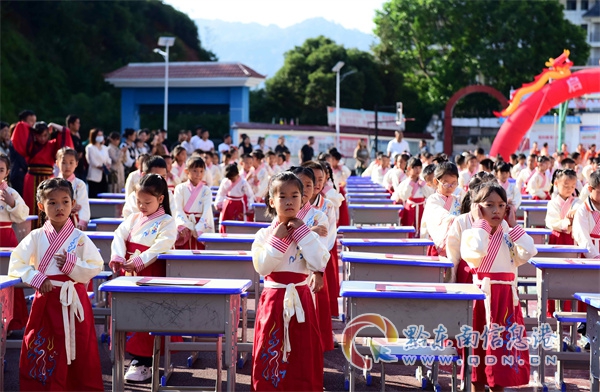 清晨的陽光灑在校園里,為這場充滿意義的活動增添了一抹溫暖的色彩。一年級的小朋友們在老師的帶領下,身著嶄新的漢服,個個精神抖擻,仿佛穿越時空,回到了古代的學堂。他們的眼神中充滿了好奇和期待,對即將開始的 “開筆禮” 充滿了憧憬。