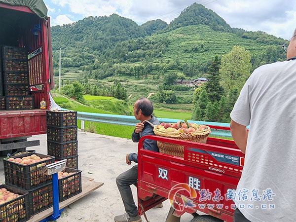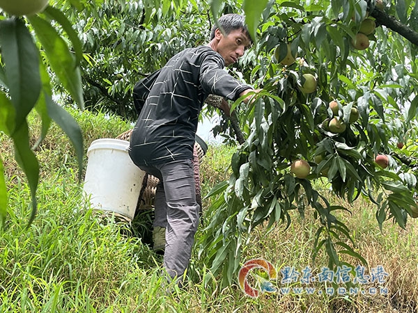 本網(wǎng)訊 七月,正值桃李成熟的季節(jié),來(lái)到位于紙房鄉(xiāng)金河村的黃平縣浩源精品水果種植場(chǎng),一個(gè)個(gè)鮮紅嫩綠的桃子掛在枝頭,工人們穿梭其中認(rèn)真地對(duì)桃子進(jìn)行采摘、搬運(yùn)、挑選和裝箱。
