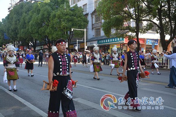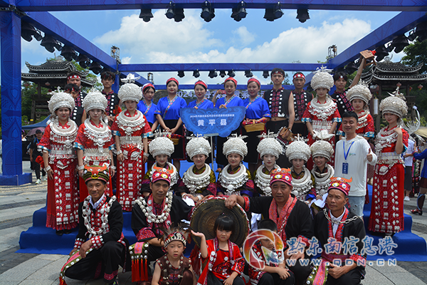 本網訊 銅鼓悠揚、銀鈴陣陣、苗家兒女幾多嬌。7月21日,由黃平縣文化館(民族藝術團)、青年藝術家、學生志愿者、苗族銅鼓隊組成的黃平苗族服飾代表隊亮相丹寨非遺系列活動盛裝巡演活動。與來自黔東南州各縣市的上千名民族同胞,共赴一場夏季非遺視覺盛宴。
