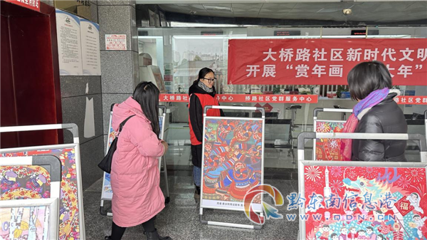 一大早,一個個身著紅馬甲的社區志愿者就忙碌起來,迎著寒風,搭架子、擺年畫,不一會兒,一幅幅刻畫著新生活、新面貌的年畫作品出現在大眾眼前,吸引了不少群眾前來觀賞、拍照。